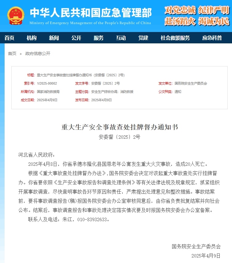 人民網(wǎng)北京4月9日電 (記者溫璐、郝萍)據(jù)應(yīng)急管理部消息,4月9日,國(guó)務(wù)院安全生產(chǎn)委員會(huì)發(fā)布向河北省人民政府發(fā)布重大生產(chǎn)安全事故查處掛牌督辦通知書。通知書稱,2025年4月8日,河北省承德市隆化縣國(guó)恩老年公寓發(fā)生重大火災(zāi)事故,造成20人死亡。根據(jù)《重大事故查處掛牌督辦辦法》,國(guó)務(wù)院安委會(huì)決定對(duì)該起重大事故查處實(shí)行掛牌督辦。河北省要依照《生產(chǎn)安全事故報(bào)告和調(diào)查處理?xiàng)l例》等有關(guān)法律法規(guī)及規(guī)章規(guī)定,抓緊組織開展事故調(diào)查,盡快查明事故各環(huán)節(jié)原因和責(zé)任,嚴(yán)肅提出處理意見和整改措施。事故結(jié)案前,要將事故調(diào)查報(bào)告(稿)報(bào)國(guó)務(wù)院安委會(huì)辦公室審核同意后,由河北省負(fù)責(zé)批復(fù)結(jié)案并向社會(huì)公布。結(jié)案后,事故調(diào)查報(bào)告和事故處理決定落實(shí)情況要及時(shí)報(bào)國(guó)務(wù)院安委會(huì)辦公室備案。