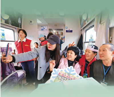 為讓銀發(fā)旅游更加精彩,銀發(fā)旅游列車不僅注重適老化改造,還通過特色主題表演,為老年游客帶來豐富的旅行體驗(yàn)。在Y471次熊貓旅游專列上,游客們可以欣賞到別具特色的川劇變臉。在黑龍江的冰雪旅拍主題旅游列車上,車廂內(nèi)融合哈爾濱各類景點(diǎn)進(jìn)行主題場(chǎng)景設(shè)計(jì),老年游客只需掃碼預(yù)約便可換上不同風(fēng)格的服裝在車廂內(nèi)拍照打卡。列車上,老年游客不僅樂趣十足,還留下許多美好回憶。