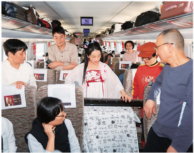 3月26日,在“樂游長(zhǎng)三角”銀發(fā)旅游專列上,游客正在欣賞古琴表演。