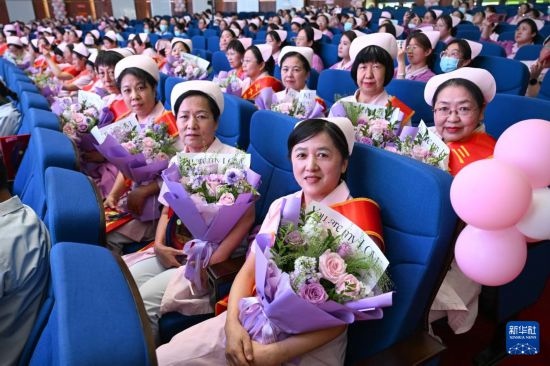 5月9日在內(nèi)蒙古自治區(qū)婦幼保健院學術報告廳拍攝的接受表彰的護士們。