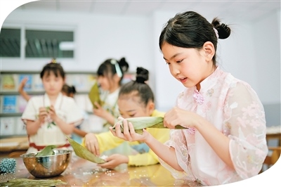 在山東省青島市市北區(qū)杭州路小學(xué),學(xué)生體驗(yàn)包粽子。