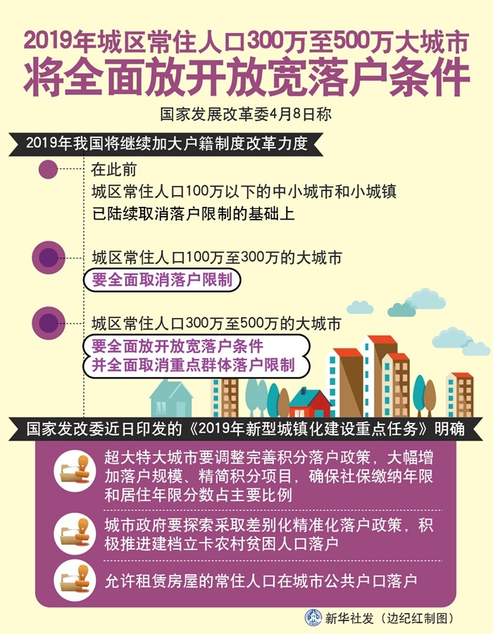 國家發(fā)展改革委8日稱,2019年我國將繼續(xù)加大戶籍制度改革力度,在此前城區(qū)常住人口100萬以下的中小城市和小城鎮(zhèn)已陸續(xù)取消落戶限制的基礎(chǔ)上,城區(qū)常住人口100萬至300萬的大城市要全面取消落戶限制;城區(qū)常住人口300萬至500萬的大城市要全面放開放寬落戶條件,并全面取消重點群體落戶限制。