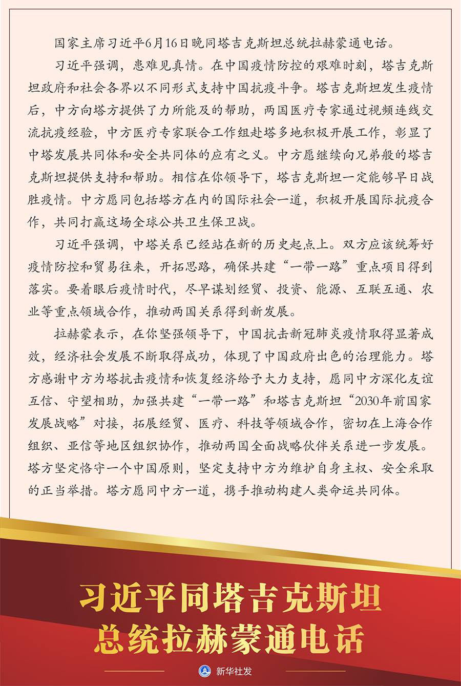 新華社北京6月16日電 國(guó)家主席習(xí)近平6月16日晚同塔吉克斯坦總統(tǒng)拉赫蒙通電話。