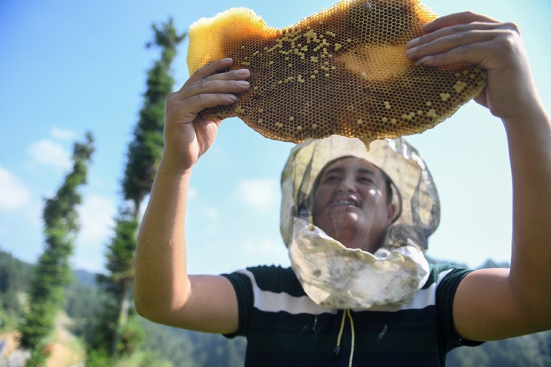 △十八洞村村民龍先蘭學(xué)習(xí)養(yǎng)蜂技術(shù),因地制宜發(fā)展養(yǎng)蜂產(chǎn)業(yè),逐漸成為養(yǎng)蜂大戶,還收獲了甜蜜的愛情。