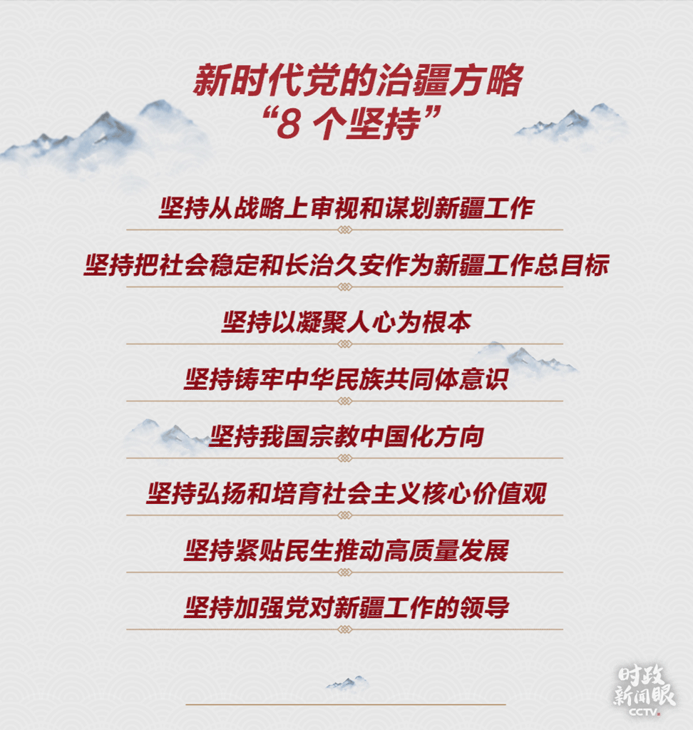 就在此次座談會(huì)一個(gè)月前,總書記在中央第七次西藏工作座談會(huì)上以“10個(gè)必須”概括了新時(shí)代黨的治藏方略,其中寫入了總書記多次談到的戰(zhàn)略思想:“治國必治邊、治邊先穩(wěn)藏”。而在新時(shí)代黨的治疆方略中,也重申了多次強(qiáng)調(diào)的新疆工作總目標(biāo):“社會(huì)穩(wěn)定、長治久安”。
