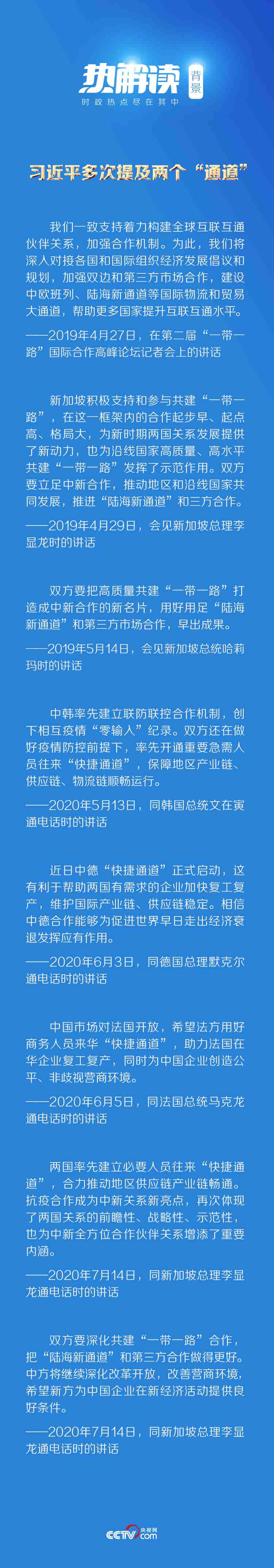 7月14日,習(xí)近平主席同新加坡總理李顯龍通電話。他在通話中表示,“疫情發(fā)生以來,中新兩國政府和各界互施援手,守望相助”,并特別提到了“快捷通道”和“陸海新通道”這兩條“通道”。