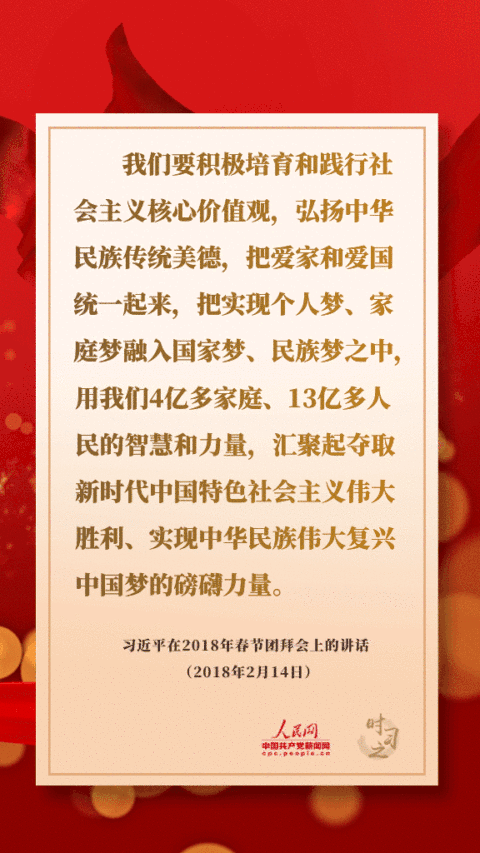 我們要積極培育和踐行社會(huì)主義核心價(jià)值觀,弘揚(yáng)中華民族傳統(tǒng)美德,把愛家和愛國統(tǒng)一起來,把實(shí)現(xiàn)個(gè)人夢(mèng)、家庭夢(mèng)融入國家夢(mèng)、民族夢(mèng)之中,用我們4億多家庭、13億多人民的智慧和力量,匯聚起奪取新時(shí)代中國特色社會(huì)主義偉大勝利、實(shí)現(xiàn)中華民族偉大復(fù)興中國夢(mèng)的磅礴力量。