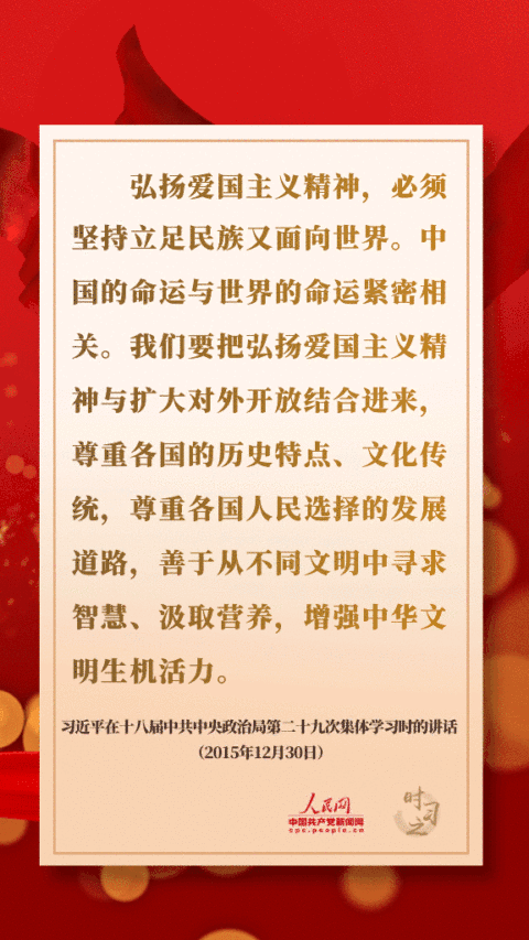 弘揚(yáng)愛國主義精神,必須堅(jiān)持立足民族又面向世界。中國的命運(yùn)與世界的命運(yùn)緊密相關(guān)。我們要把弘揚(yáng)愛國主義精神與擴(kuò)大對(duì)外開放結(jié)合進(jìn)來,尊重各國的歷史特點(diǎn)、文化傳統(tǒng),尊重各國人民選擇的發(fā)展道路,善于從不同文明中尋求智慧、汲取營養(yǎng),增強(qiáng)中華文明生機(jī)活力。