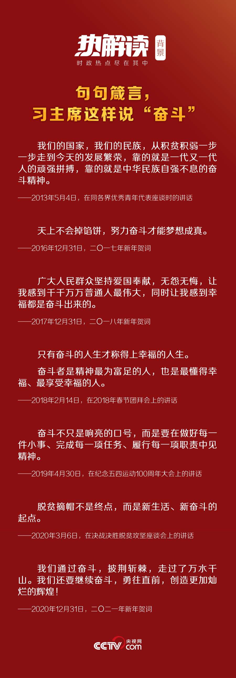 2020年,“十三五”圓滿收官,“十四五”全面擘畫;2021年,既是“十四五”開局之年,又是“兩個一百年”的歷史交匯點,全面建設社會主義現代化國家新征程即將開啟。在這個關鍵節(jié)點再次強調“奮斗”,習近平主席意蘊深遠。