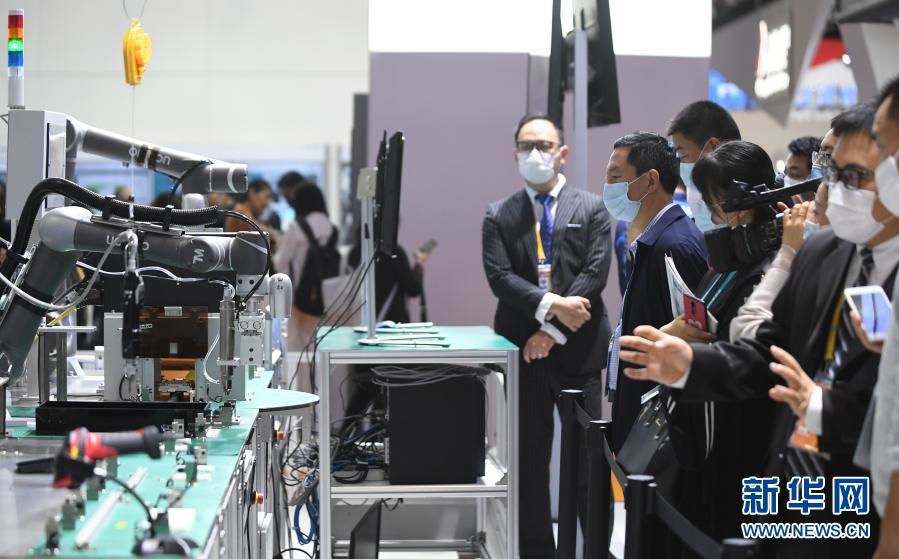 2020年11月6日,在進(jìn)博會(huì)技術(shù)裝備展區(qū),人們在西門子展臺(tái)觀看人機(jī)協(xié)作的智能化單元生產(chǎn)線。新華社記者 李任滋 攝