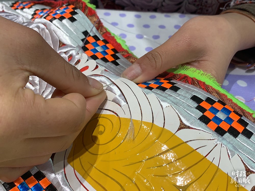 25歲的楊文麗是這家扶貧車間的負(fù)責(zé)人,她的刺繡手藝是從小跟母親學(xué)的。楊文麗告訴《時政新聞眼》,苗繡分手工繡和機繡。一件手工繡的“歪梳苗服飾”要賣到上萬元。如今,車間的苗繡成品有近70%是通過直播帶貨銷售出去的。
