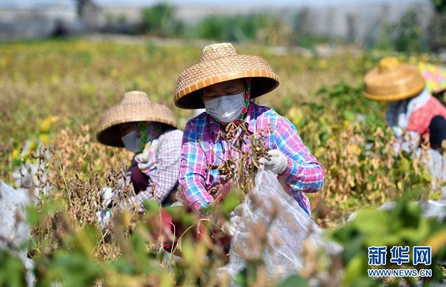 工人在采收中國(guó)農(nóng)業(yè)科學(xué)院油料作物研究所在三亞繁育的大豆(2020年2月27日)。新華社記者 郭程 攝