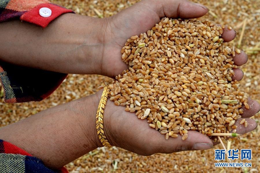 山東省滕州市東沙河鎮(zhèn)小宮山村村民在展示新收的“濟(jì)麥22”麥粒(2015年6月4日攝)。新華社記者 馮杰 攝
