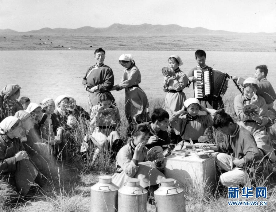 20世紀七十年代,錫林郭勒盟烏蘭牧騎隊員在草原上為牧民演出(資料照片)。新華社發(fā)