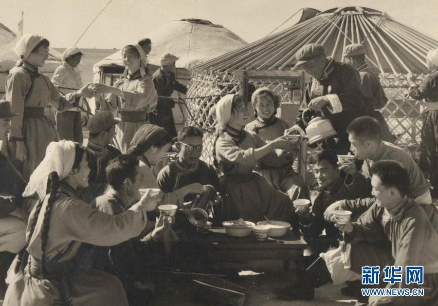20世紀六七十年代,內(nèi)蒙古自治區(qū)錫林郭勒盟蘇尼特右旗烏蘭牧騎隊員在草原上為周邊牧民表演節(jié)目(資料照片)。新華社發(fā)