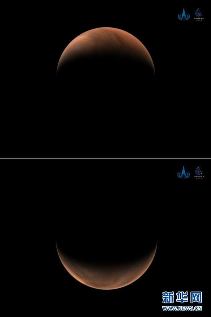 2021年3月26日,國(guó)家航天局發(fā)布2幅由我國(guó)首次火星探測(cè)任務(wù)天問一號(hào)探測(cè)器拍攝的南、北半球火星側(cè)身影像。這是一張拼版照片,上圖為:北半球上方火星影像;下圖為:南半球上方火星影像?! ?/p>
