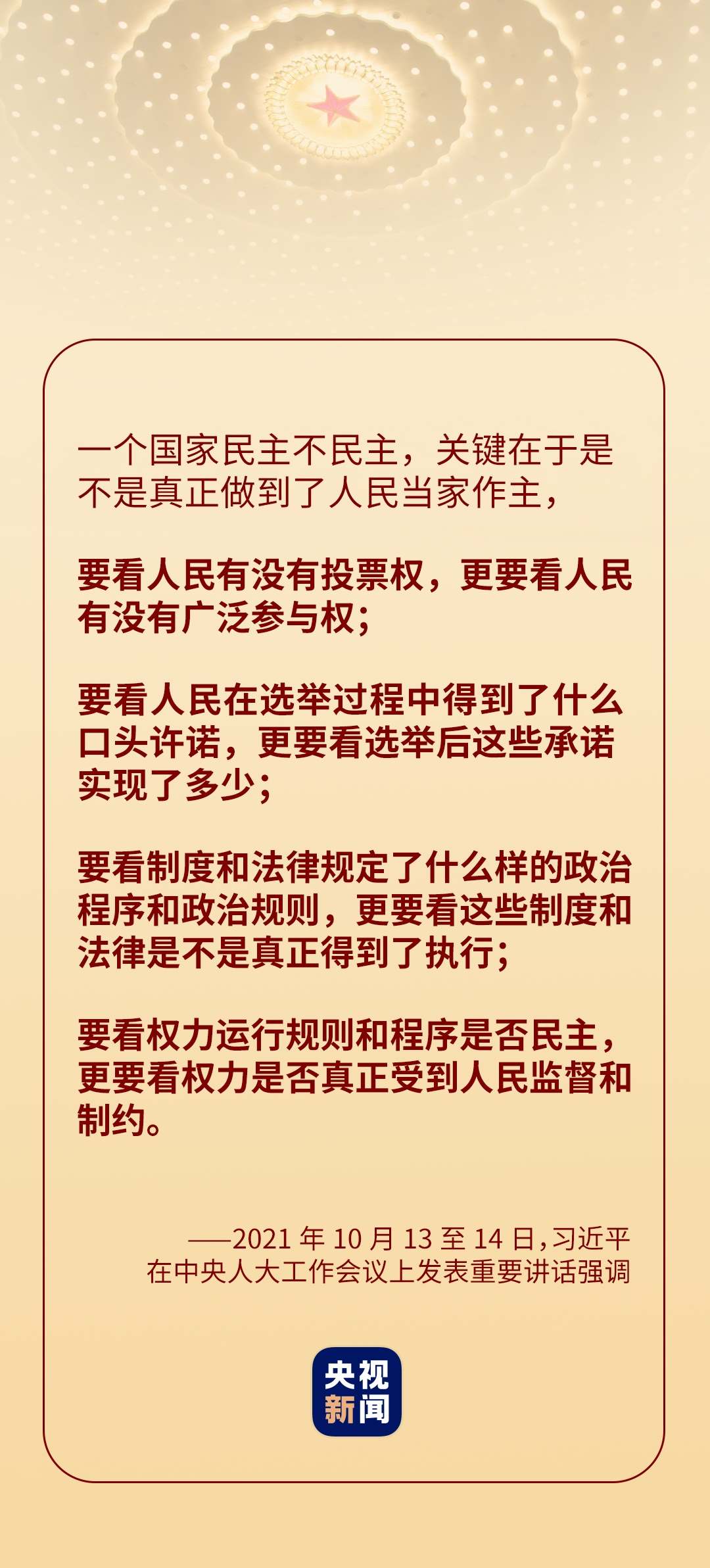 “黨的十八大以來(lái),我們深化對(duì)民主政治發(fā)展規(guī)律的認(rèn)識(shí),提出全過(guò)程人民民主的重大理念?!痹谥醒肴舜蠊ぷ鲿?huì)議上,習(xí)近平全面闡釋了“全過(guò)程人民民主”的深刻內(nèi)涵——實(shí)現(xiàn)了過(guò)程民主和成果民主、程序民主和實(shí)質(zhì)民主、直接民主和間接民主、人民民主和國(guó)家意志相統(tǒng)一,是全鏈條、全方位、全覆蓋的民主,是最廣泛、最真實(shí)、最管用的社會(huì)主義民主。