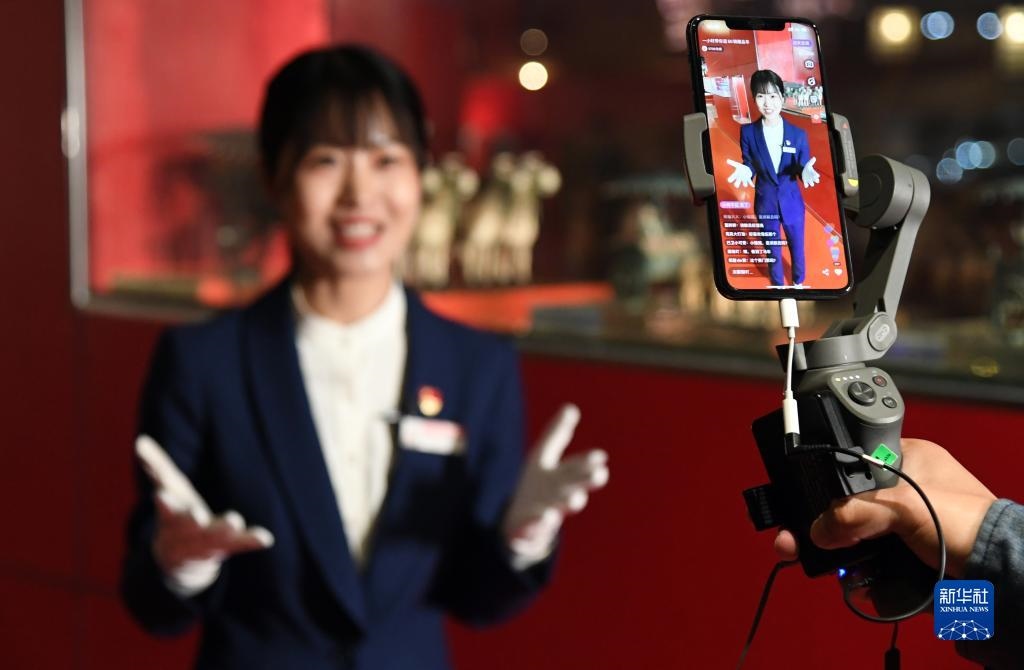 2020年4月30日,在北京汽車(chē)博物館,講解員曾紅娟通過(guò)網(wǎng)絡(luò)直播平臺(tái)為觀眾介紹館內(nèi)的藏品車(chē)。新華社記者 任超/攝