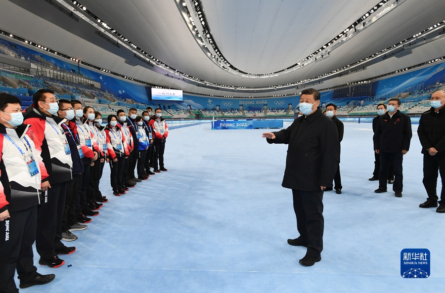 1月4日,中共中央總書記、國家主席、中央軍委主席習(xí)近平在北京考察2022年冬奧會、冬殘奧會籌辦備賽工作。這是4日上午,習(xí)近平在國家速滑館考察。新華社記者 謝環(huán)馳 攝