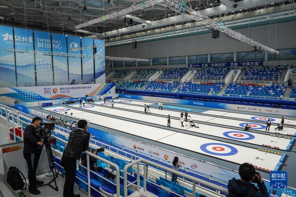 2021年4月6日,運動員在冰壺項目測試活動中。2022年北京冬奧會將國家游泳中心“水立方”改造為“冰立方”,用作冰壺項目比賽場館,有效減少建設投資,更讓夏奧場館煥然新生,拓展多元賽后經營能力。新華社記者彭子洋攝
