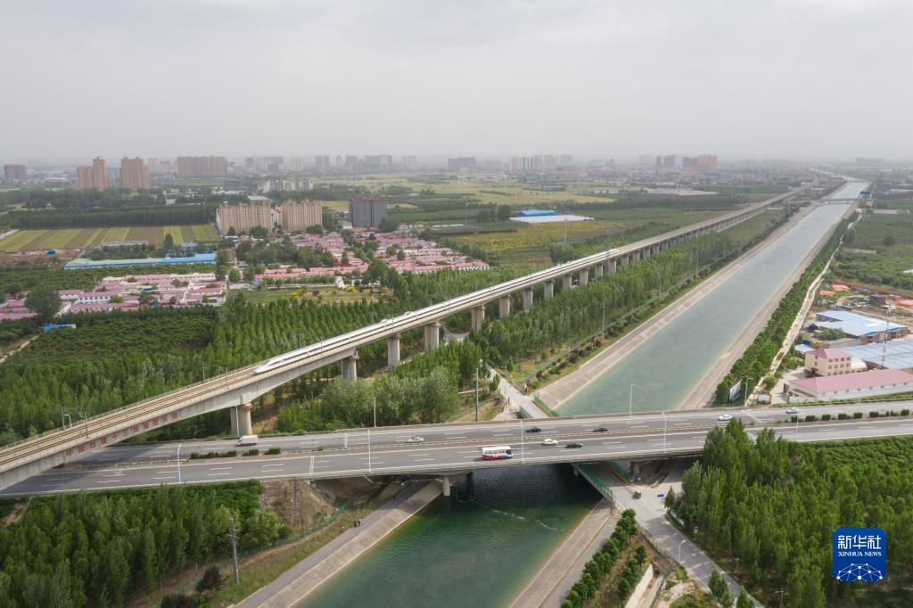 在河北省石家莊市正定縣以北的于家莊村附近,南水北調(diào)中線干渠與高鐵、公路交織(2021年5月24日攝,無(wú)人機(jī)照片)。新華社記者 才揚(yáng) 攝