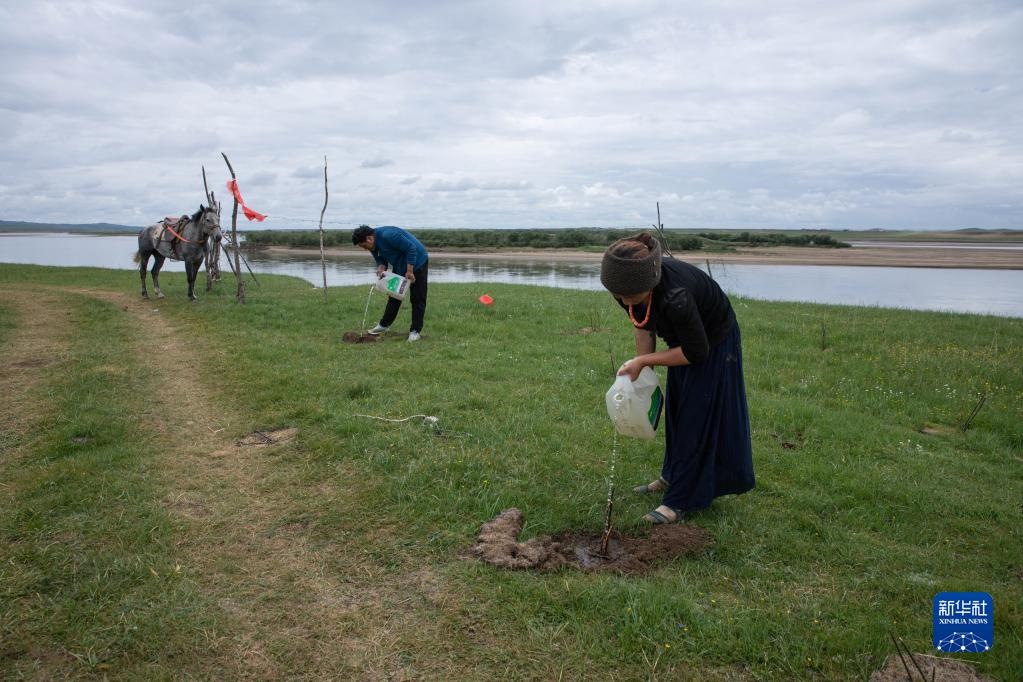 四川省若爾蓋縣麥溪鄉(xiāng)嘎沙村巡河隊(duì)的村民在黃河邊給新種的柳樹(shù)澆水(2022年7月26日攝)。新華社記者 江宏景 攝
