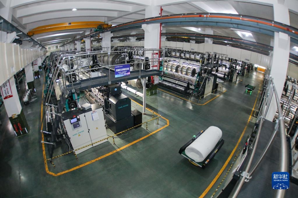 福建晉江,華宇錚鎣集團第五經編車間內,一排排經編機正在高速運轉,AGV物流機器人不停穿梭其中。