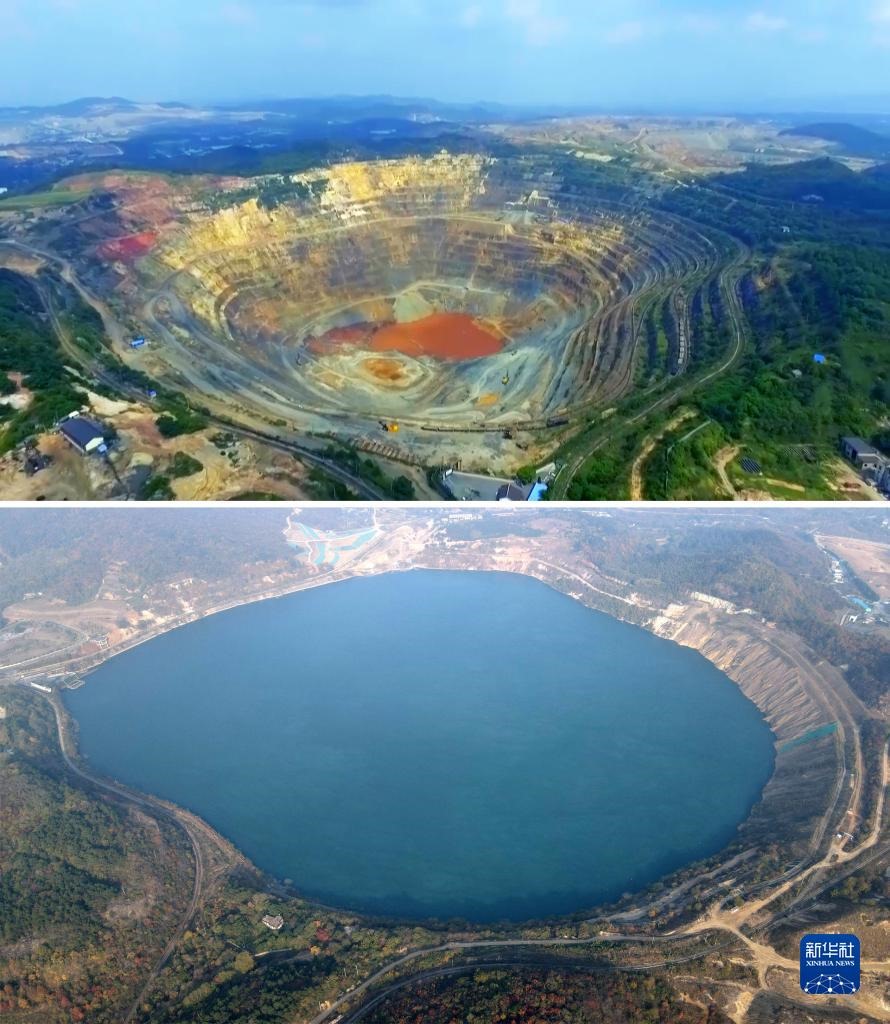 拼版照片:上圖為開采中的安徽省馬鞍山市雨山區(qū)向山鎮(zhèn)凹山采場(chǎng)(資料照片),下圖為生態(tài)修復(fù)后的凹山采場(chǎng)(新華社記者劉軍喜11月8日攝,無人機(jī)照片)。新華社發(fā)