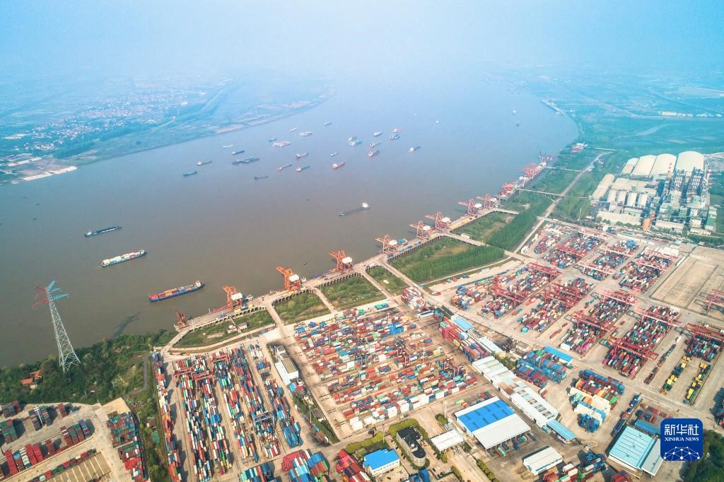 這是武漢長(zhǎng)江中游航運(yùn)中心核心港陽邏港(2020年4月12日攝,無人機(jī)照片)。新華社記者 肖藝九 攝