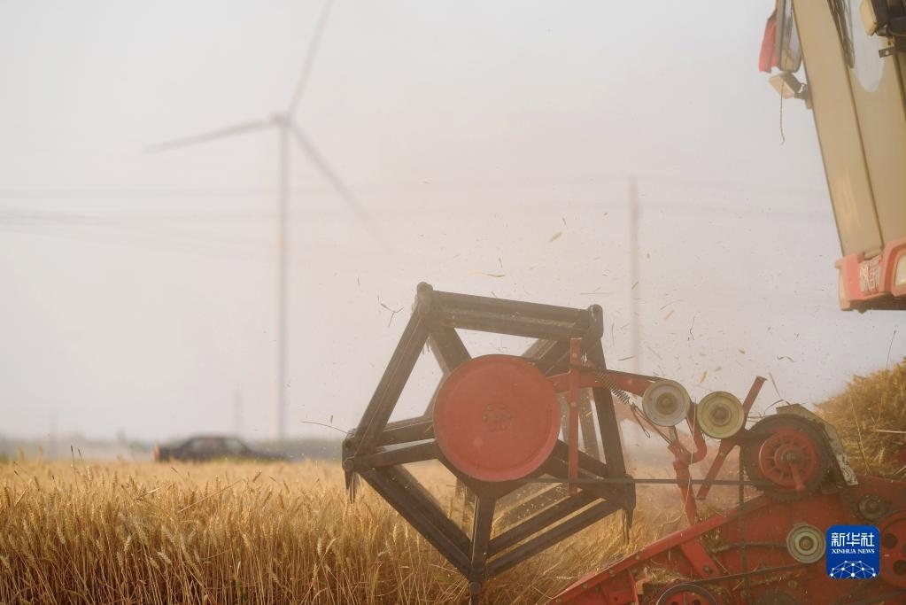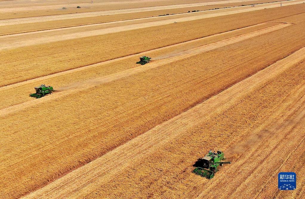 在河南省安陽市湯陰縣菜園鎮(zhèn)高標(biāo)準農(nóng)田示范區(qū),收割機在麥田作業(yè)(2022年6月8日攝)。新華社記者 郝源 攝