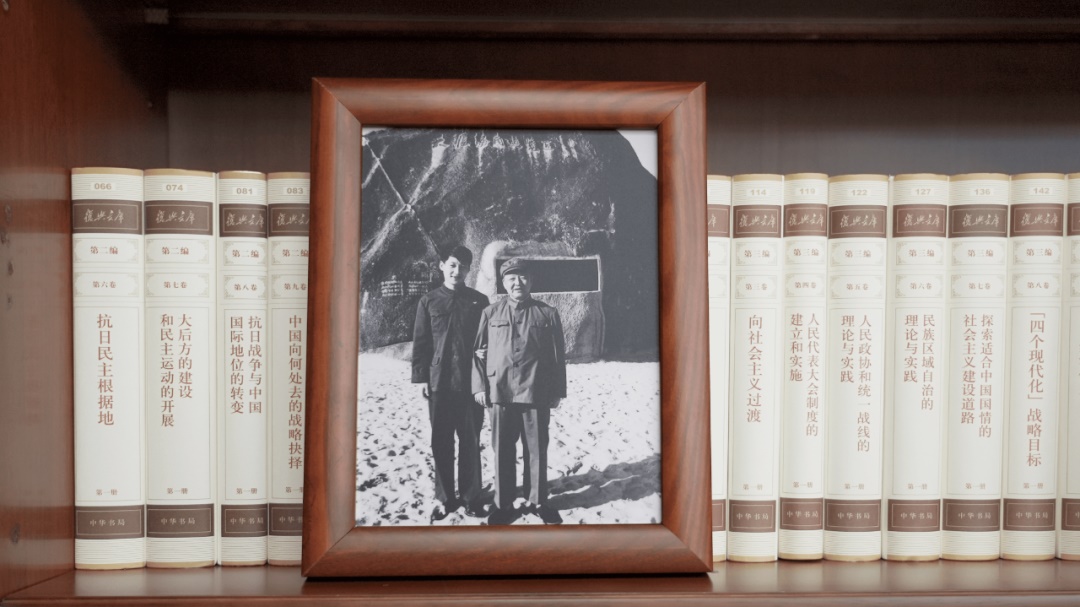 書架上擺放著一張合影。這是1999年9月30日,江澤民同志、朱镕基同志、習(xí)仲勛同志在慶祝建國(guó)五十周年招待會(huì)上。這張照片第一次出現(xiàn)在習(xí)近平總書記的書架上。