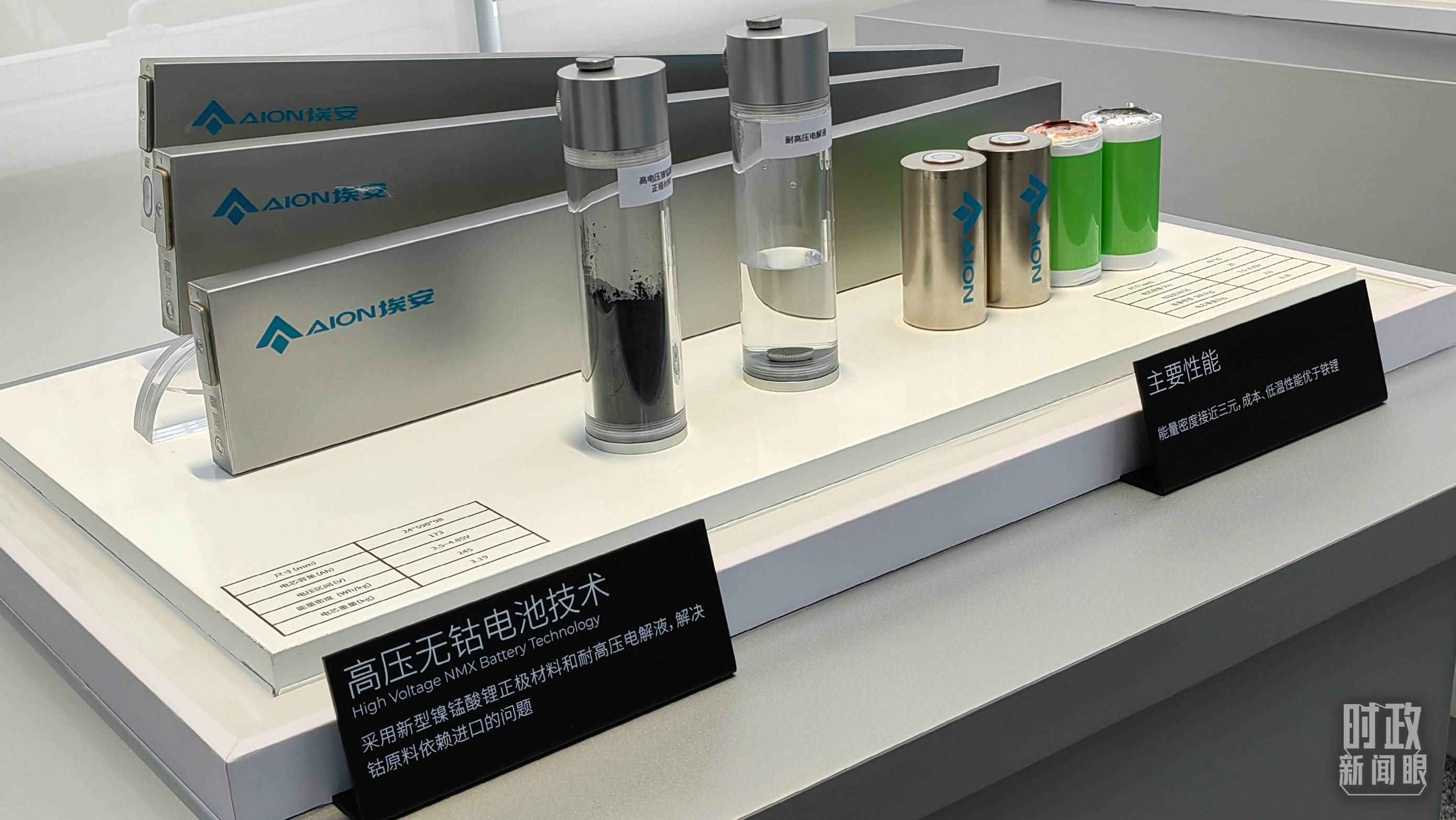 △廣汽埃安展示的高壓無鈷電池技術(shù),采用新型鎳錳酸鋰正極材料和耐高壓電解液,解決了鈷原料依賴進口的問題。(總臺央視記者張曉鵬拍攝)