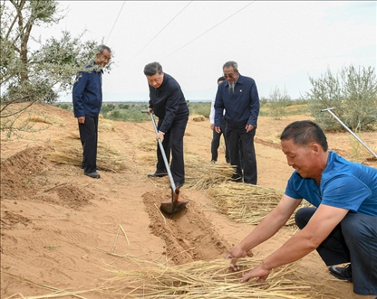 △2019年8月21日,正在甘肅考察的習(xí)近平總書記來到古浪縣八步沙林場??疾熘?,他拿起一把開溝犁,參與到治沙勞動(dòng)中。