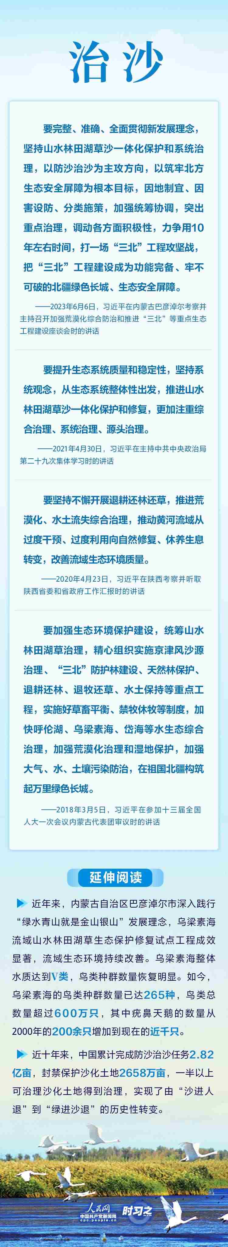 2023年6月5日至6日,中共中央總書記、國家主席、中央軍委主席習(xí)近平在內(nèi)蒙古自治區(qū)巴彥淖爾市考察,主持召開加強荒漠化綜合防治和推進(jìn)“三北”等重點生態(tài)工程建設(shè)座談會并發(fā)表重要講話。