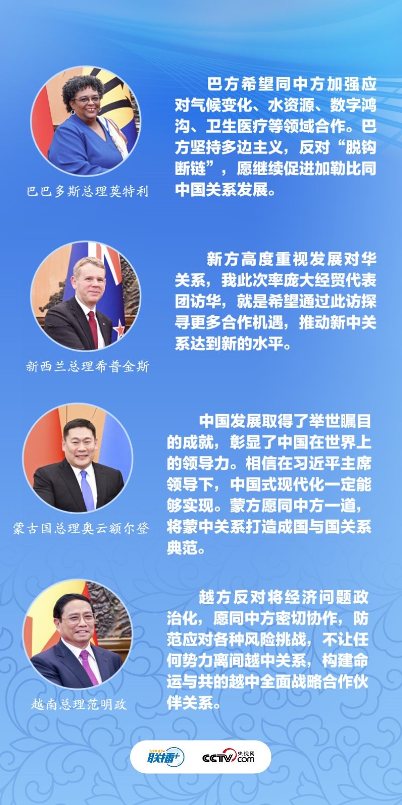 央視網(wǎng)《聯(lián)播+》梳理發(fā)現(xiàn),四場雙邊會見中,“中國式現(xiàn)代化”“命運(yùn)共同體”“一帶一路”“多邊主義”四個關(guān)鍵詞頻繁出現(xiàn)。