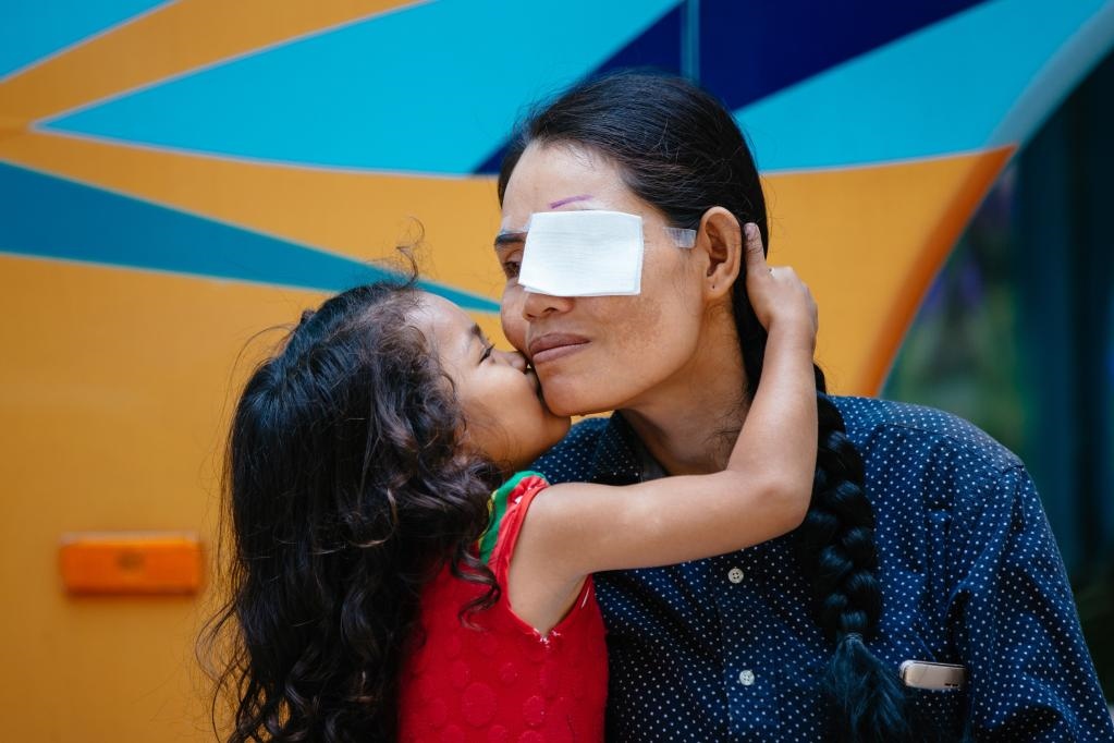 2019年3月15日,在柬埔寨磅湛省醫(yī)院,即將接受白內(nèi)障手術(shù)的患者孫美樂接受女兒的親吻祝福。在接受了中國醫(yī)療隊的白內(nèi)障義診手術(shù)后,她的視力逐步恢復(fù),生活有了新的光明和希望。