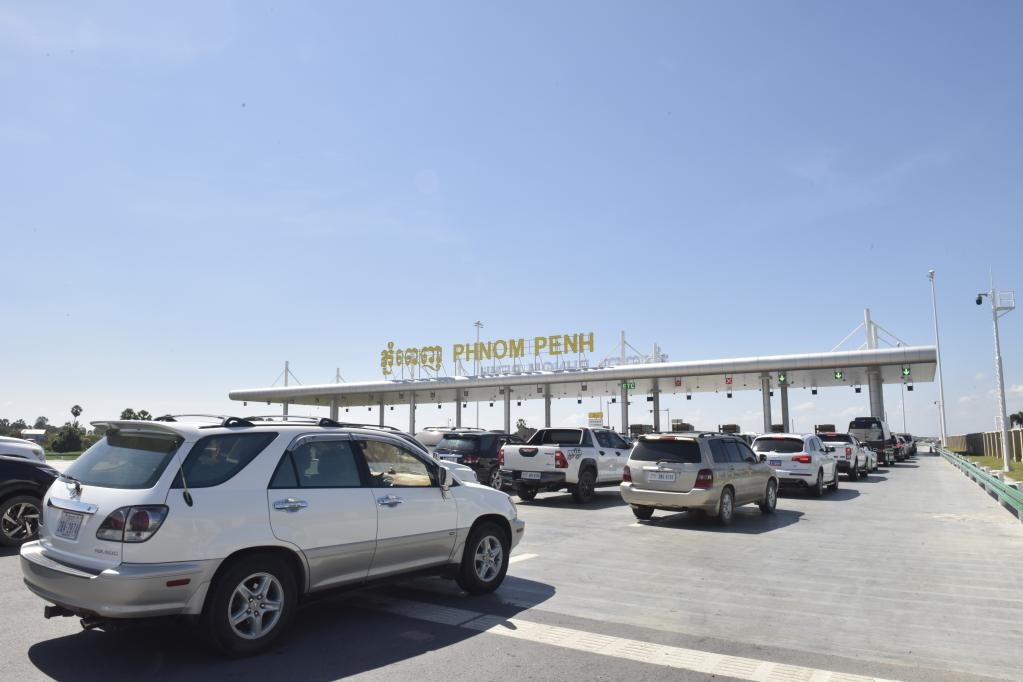 2022年11月7日,車輛在柬埔寨首都金邊的金港高速公路入口處排隊。金港高速公路連接柬埔寨首都金邊和該國最大深水海港西哈努克港。