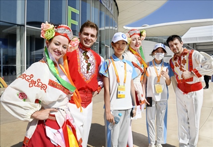 △6月15日,來自白俄羅斯的演員在表演結(jié)束后與志愿者合影。當(dāng)日,上海合作組織產(chǎn)業(yè)鏈供應(yīng)鏈論壇暨2023上合國際投資貿(mào)易博覽會(huì)在青島開幕。