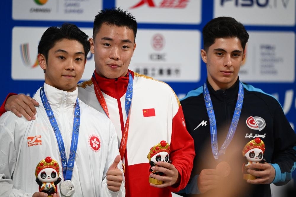 △2023年7月29日,成都大運會武術項目男子南拳冠軍中國隊選手曹茂園(中)、亞軍中國香港隊選手劉子龍(左)和季軍伊朗隊選手巴尼塔勒比在頒獎儀式上。