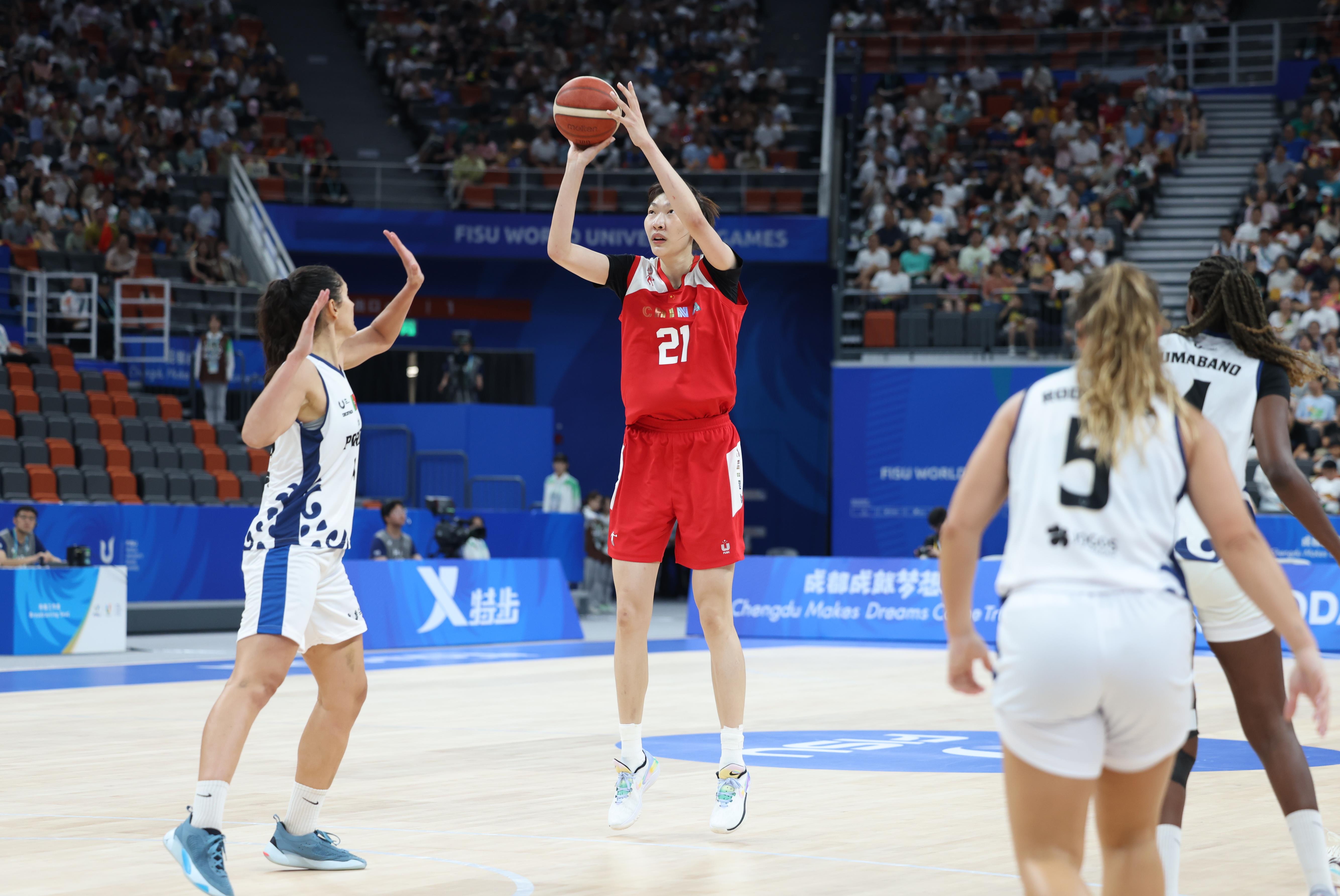 △2023年7月28日,在成都大運會女籃小組賽中,中國大學生女籃戰(zhàn)勝葡萄牙大學生女籃。