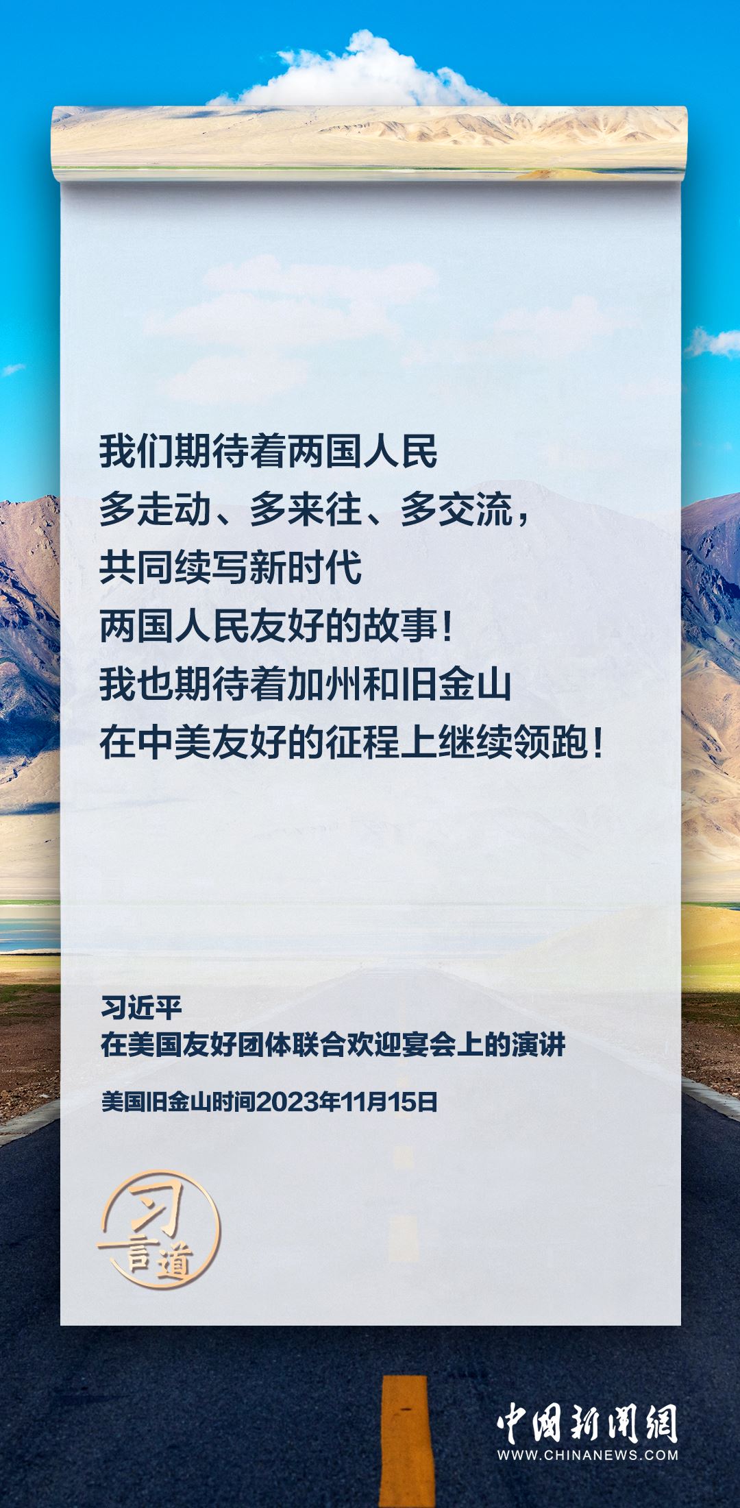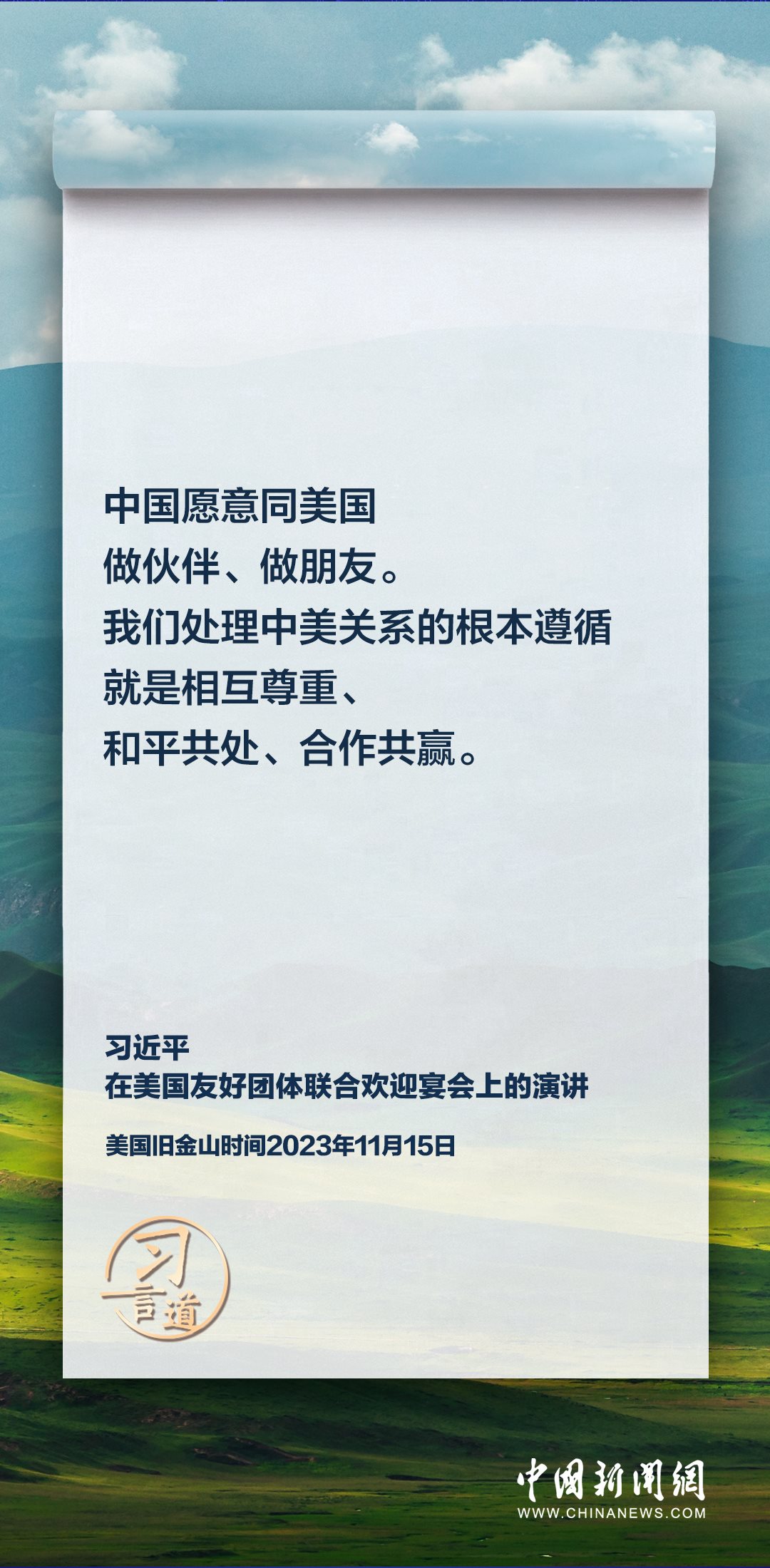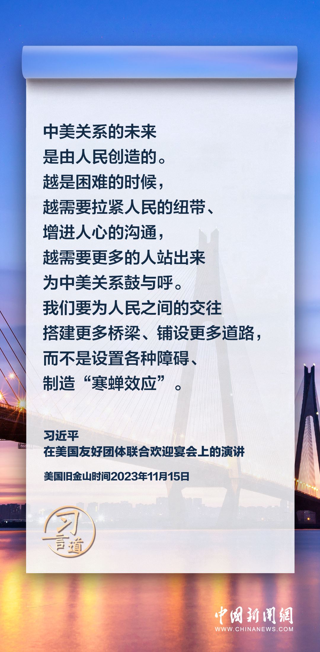 當(dāng)?shù)貢r間11月15日,中國國家主席習(xí)近平在美國舊金山出席美國友好團體聯(lián)合歡迎宴會并發(fā)表演講。習(xí)近平在演講中從“我”和“我們”說起,提出中國主張、表明中國立場、展現(xiàn)大國擔(dān)當(dāng),話語擲地有聲。