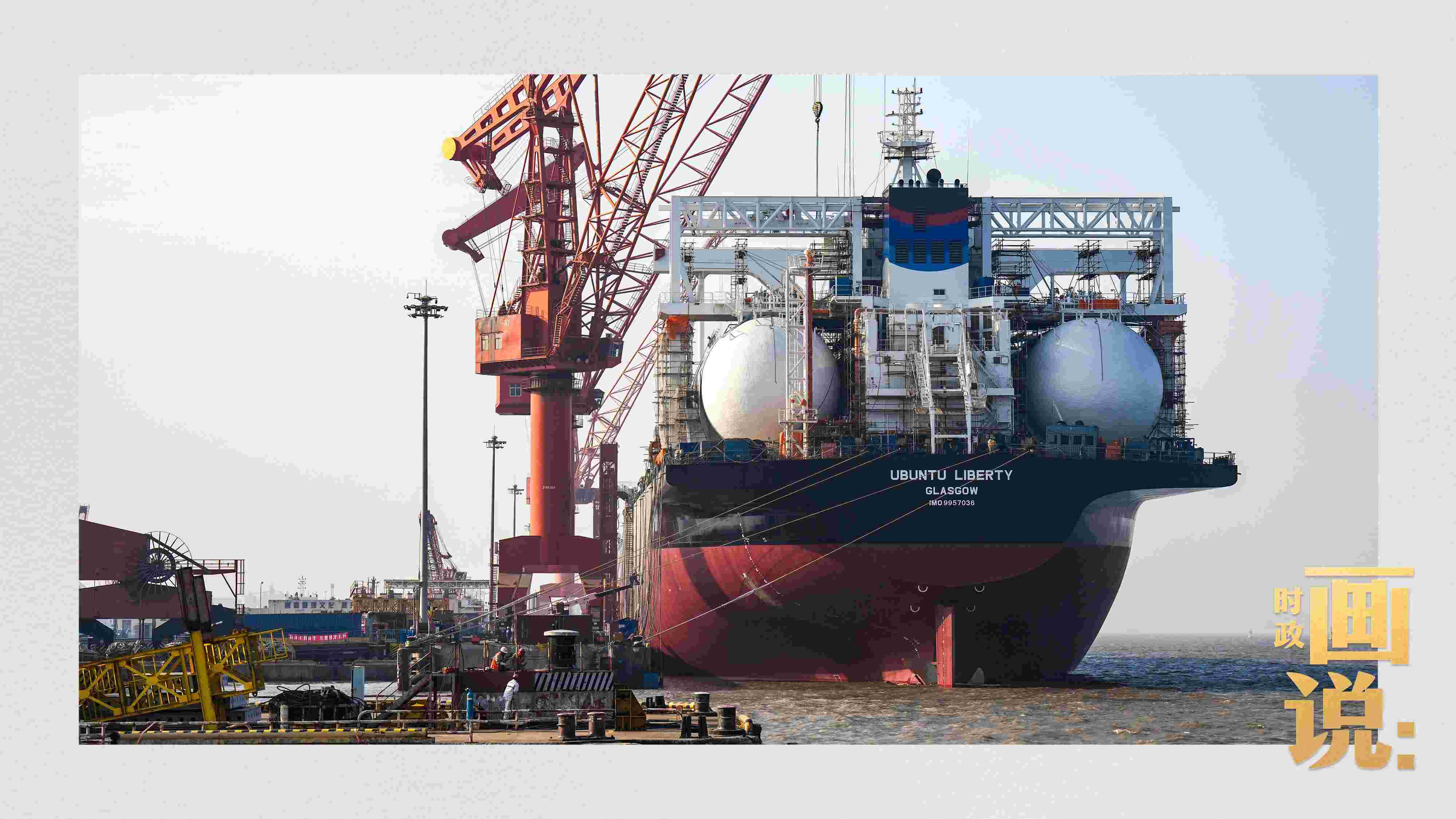 △外高橋船塢碼頭旁,一艘建造中的巨型雙燃料散貨船??吭诓次弧F謻|新區(qū),上海