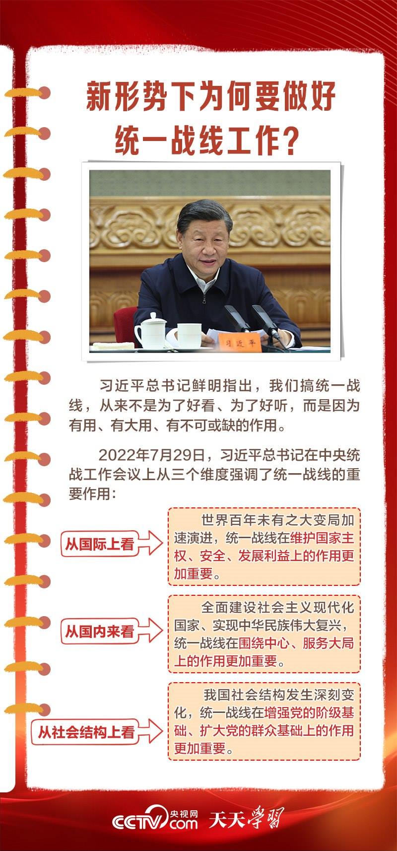在百余年的奮斗歷程中,我們黨始終把統(tǒng)一戰(zhàn)線擺在重要位置,讓團(tuán)結(jié)的旋律始終高昂,共同奮斗的力量始終激蕩。從“重要法寶”到“強(qiáng)大法寶”,體現(xiàn)出總書記對(duì)黨的統(tǒng)戰(zhàn)工作一以貫之的高度重視。