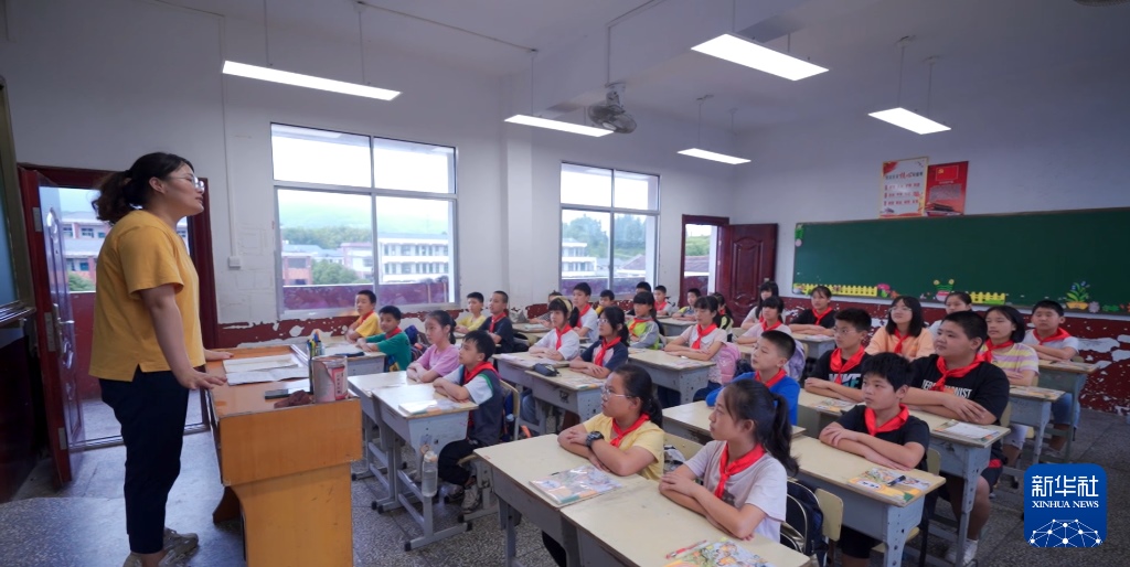 ??湖南第一師范畢業(yè)生秦葉仁在給湖南省寧鄉(xiāng)市龍?zhí)镦?zhèn)的孩子們上課。(資料照片)