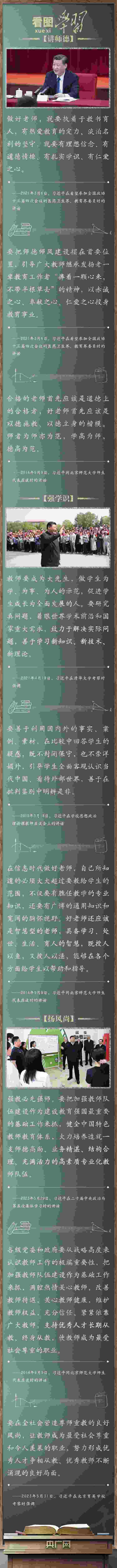 教育大計(jì),教師為本。黨的十八大以來,以習(xí)近平同志為核心的黨中央堅(jiān)持把教育擺在優(yōu)先發(fā)展的戰(zhàn)略位置,推動(dòng)新時(shí)代教育事業(yè)取得歷史性成就、發(fā)生格局性變化。習(xí)近平總書記緊扣“培養(yǎng)什么人、怎樣培養(yǎng)人、為誰培養(yǎng)人”這一教育的根本問題,對(duì)建設(shè)新時(shí)代高素質(zhì)專業(yè)化教師隊(duì)伍作出一系列重要指示,激勵(lì)廣大教師立德修身、敬業(yè)立學(xué),強(qiáng)調(diào)要在全黨全社會(huì)弘揚(yáng)尊師重教的社會(huì)風(fēng)尚。在第四十個(gè)教師節(jié)到來之際,讓我們一起牢記并踐行總書記的殷殷囑托!