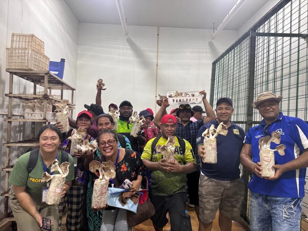 2月28日,在斐濟楠迪,培訓班學員手捧菌草菇合影。新華社發(fā)(中國援斐濟菌草技術(shù)示范中心供圖)