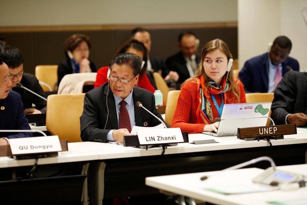 2019年4月18日,在位于紐約的聯(lián)合國總部,林占熺(前排中)在“菌草技術(shù):‘一帶一路’倡議對促進落實聯(lián)合國2030年可持續(xù)發(fā)展議程的實質(zhì)性貢獻”專題研討會上發(fā)言。新華社記者 李木子 攝