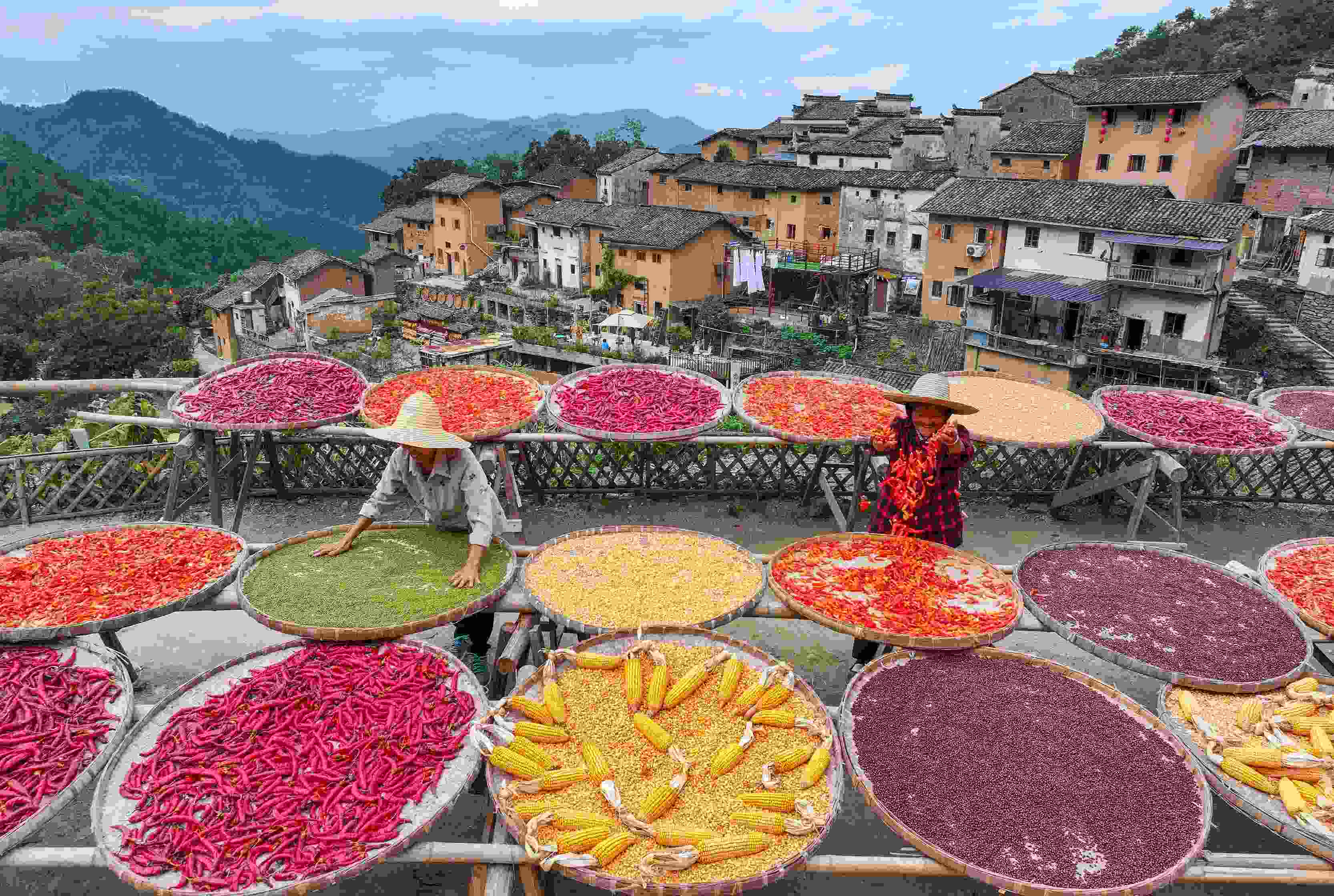 △2024年9月22日,安徽省黃山市歙縣陽(yáng)產(chǎn)村,村民正在土樓前晾曬農(nóng)作物。
