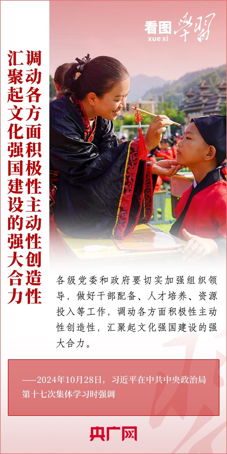 建設文化強國是全黨全社會的共同任務。10月28日,中共中央政治局就建設文化強國進行第十七次集體學習。習近平總書記在聽取講解和討論后發(fā)表重要講話,就錨定2035年建成文化強國戰(zhàn)略目標作出最新部署,強調(diào)要“不斷發(fā)展具有強大思想引領力、精神凝聚力、價值感召力、國際影響力的新時代中國特色社會主義文化,不斷增強人民精神力量,筑牢強國建設、民族復興的文化根基?!币黄饋韺W習!
