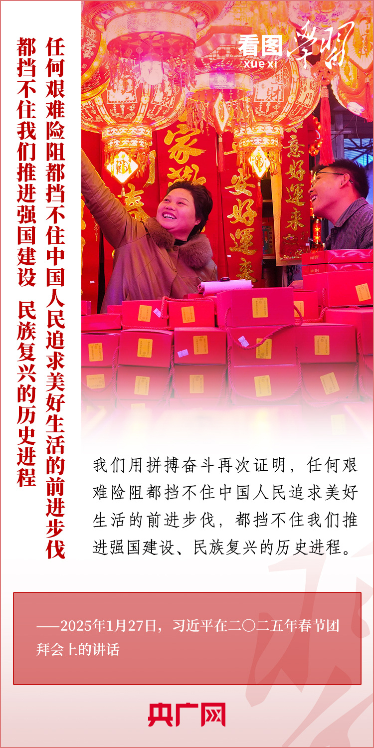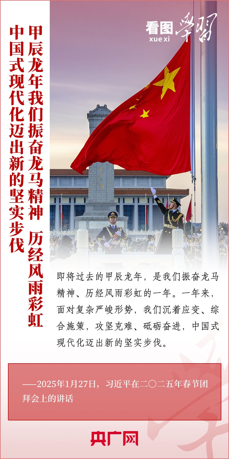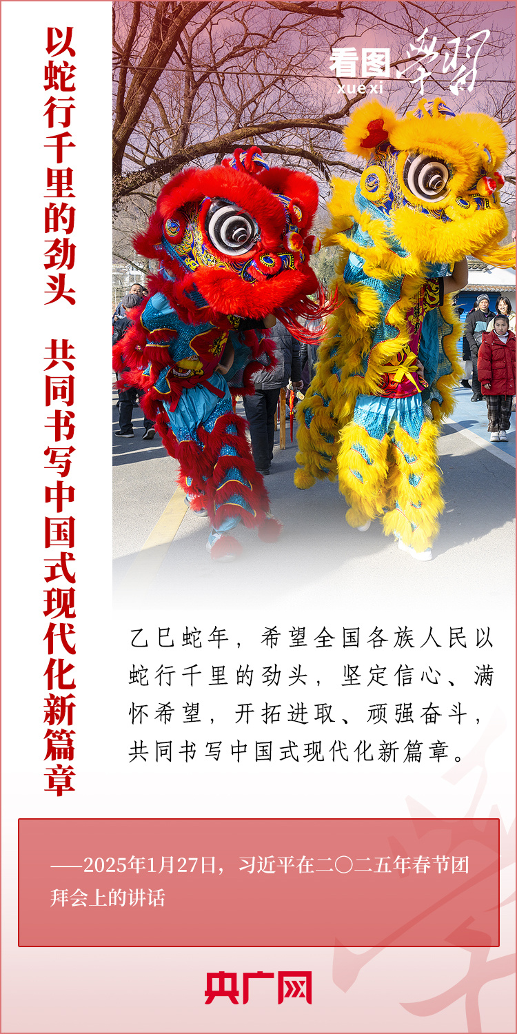 1月27日,中共中央、國(guó)務(wù)院在北京舉行春節(jié)團(tuán)拜會(huì),習(xí)近平總書記發(fā)表熱情洋溢的講話,向全國(guó)各族人民、港澳臺(tái)同胞、海外僑胞拜年并致以新春祝福??倳浽谥v話中深情回顧過(guò)去一年中國(guó)式現(xiàn)代化取得很不平凡的發(fā)展歷程,“希望全國(guó)各族人民以蛇行千里的勁頭,堅(jiān)定信心、滿懷希望,開拓進(jìn)取、頑強(qiáng)奮斗,共同書寫中國(guó)式現(xiàn)代化新篇章?!币黄饋?lái)學(xué)習(xí)!